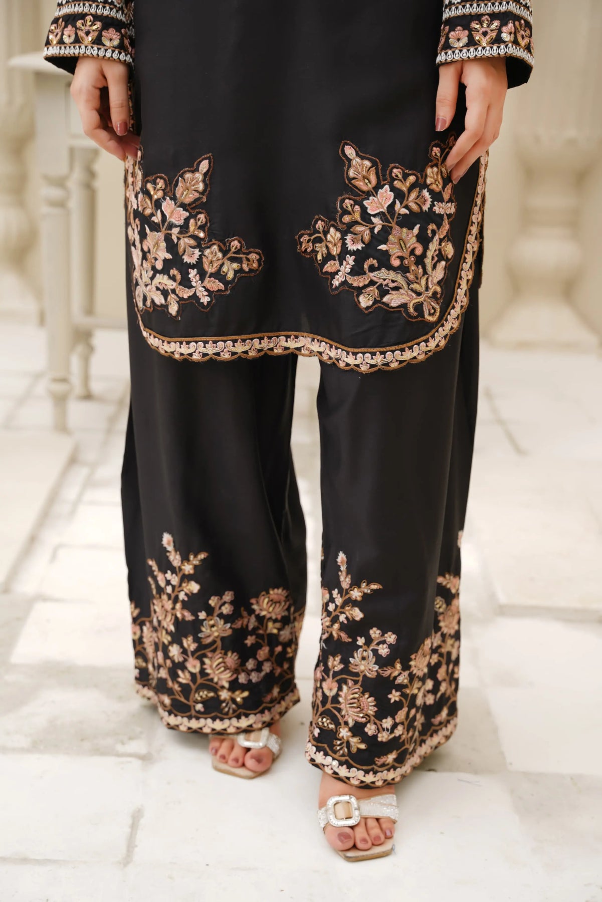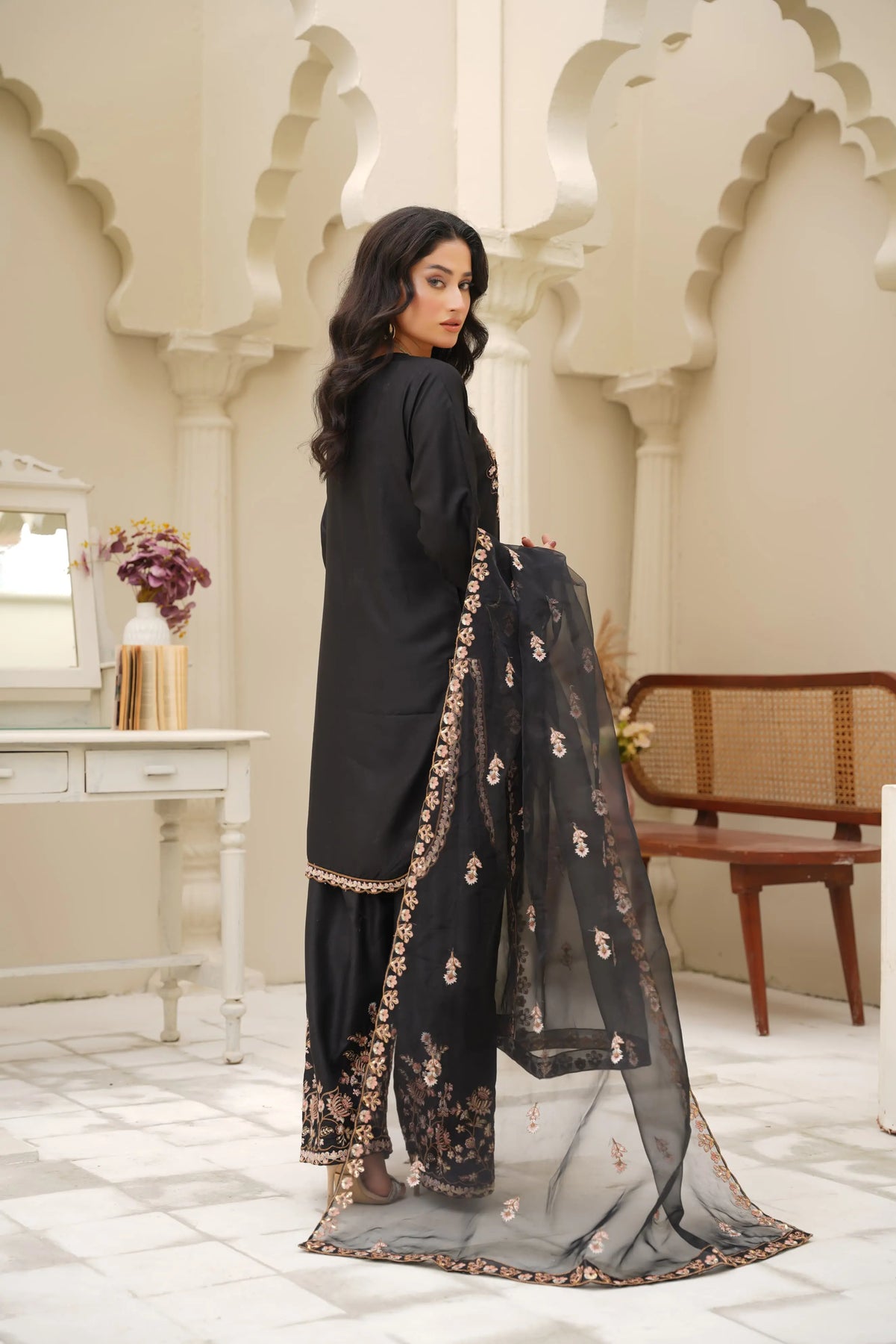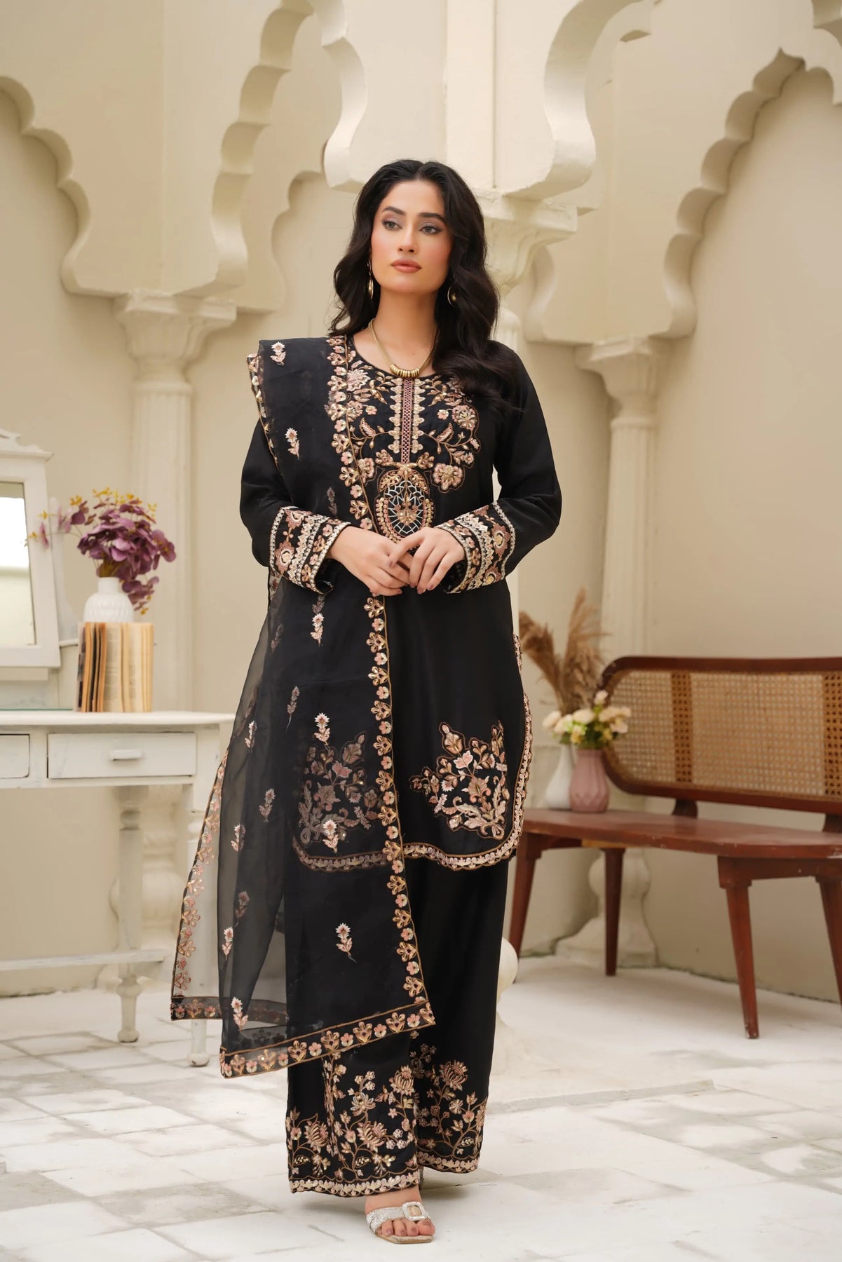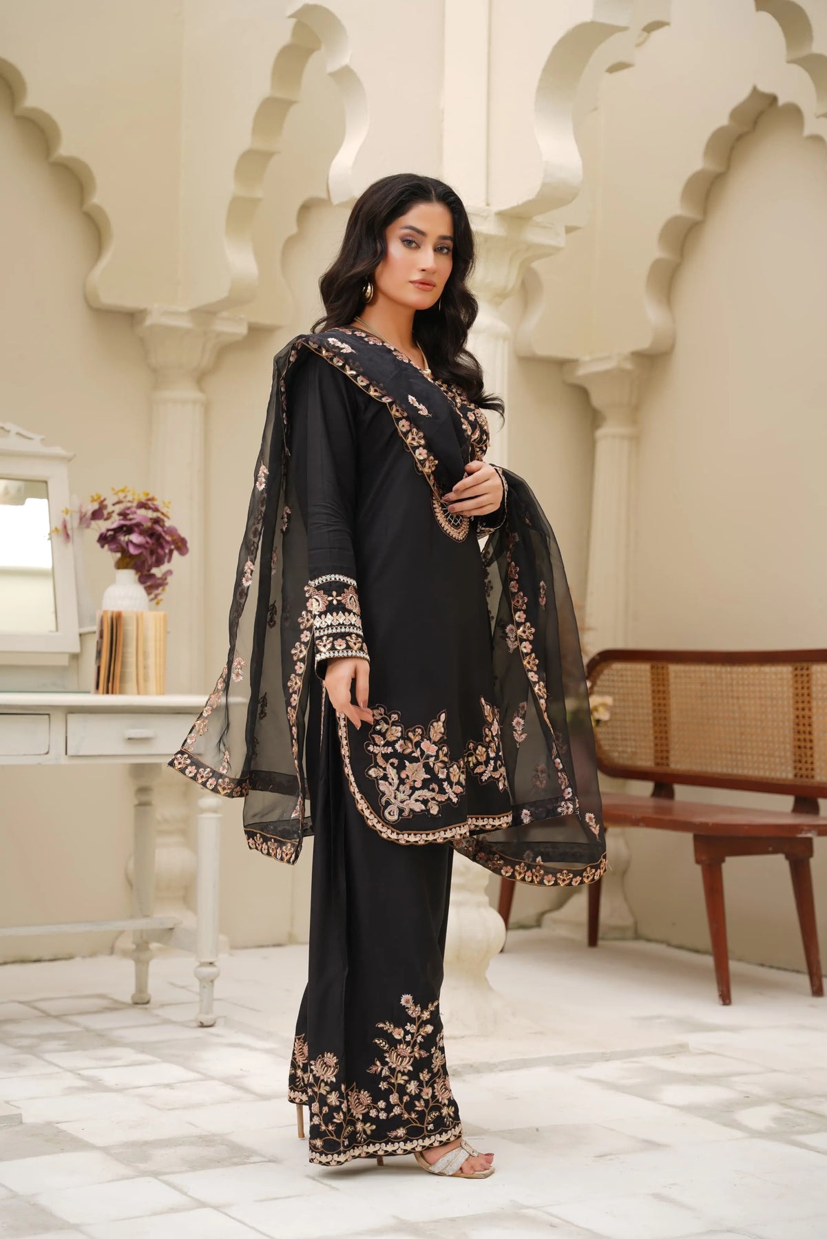 Crafted on a premium stone linen shirt and trouser with an embroidered organza dupatta, this ensemble blends refined detailing with comfortable drape. Intricate threadwork across the shirt and sleeves frames a graceful silhouette, while the coordinated trouser and delicate organza dupatta complete a polished look ideal for weddings, formal dinners, and festive evenings. A perfect ready-to-wear choice for those who value elegance and ease.