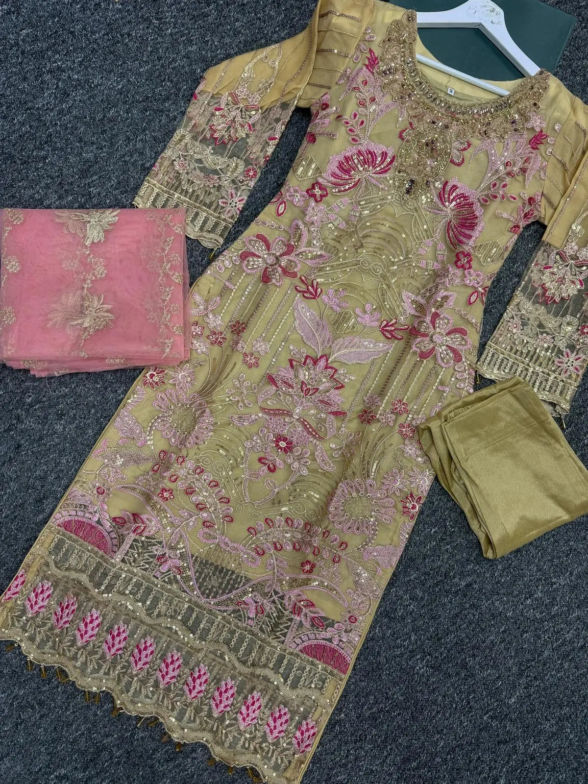Gold & Pink Embroidered Chiffon Womenswear Traditional Readymade | NIL060