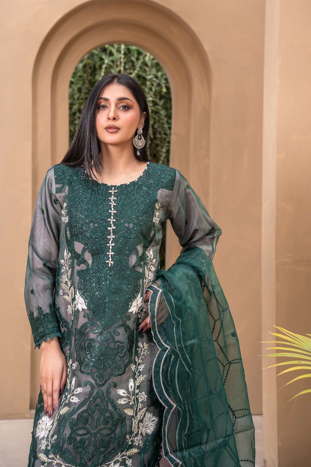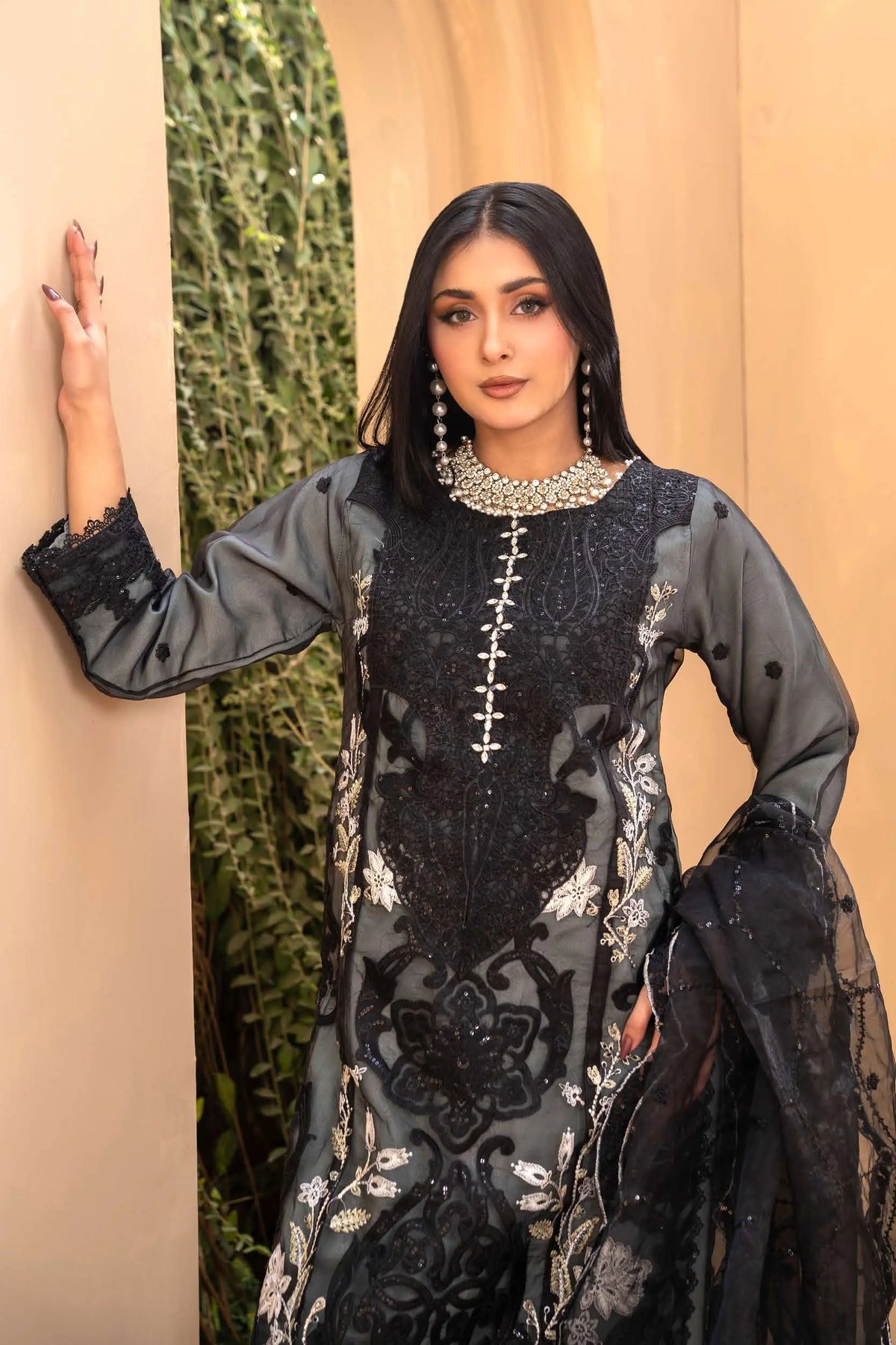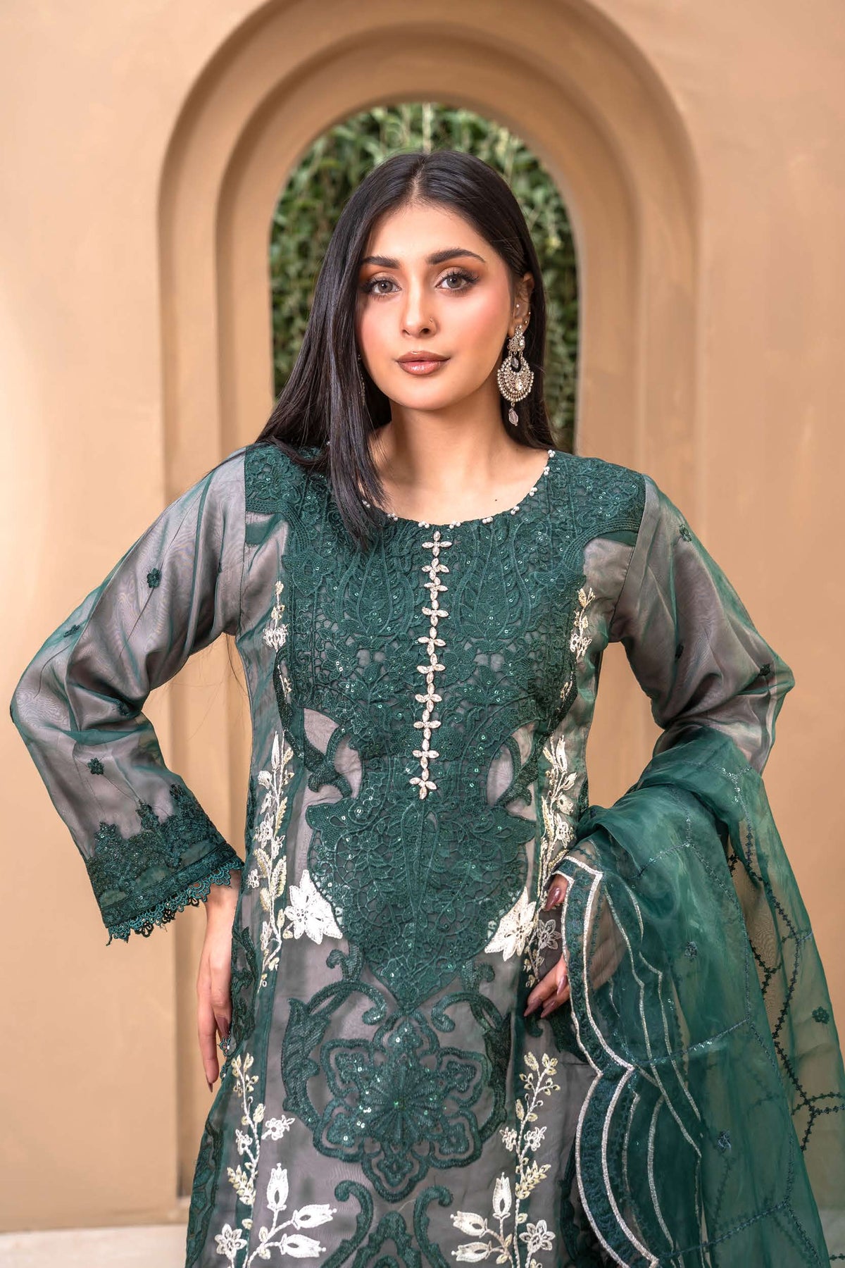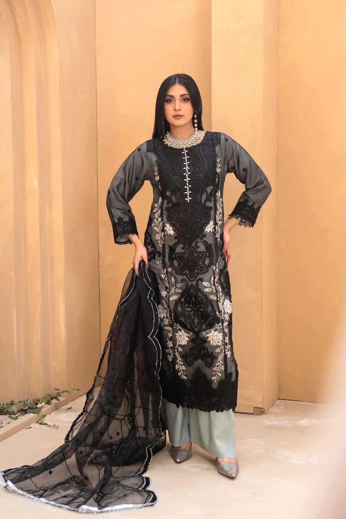 Crafted from premium organza, the shirt features intricate embroidery elevated with exquisite handwork detailing — adding texture, shimmer, and artisanal charm. The combination of fine threadwork and handcrafted accents creates a soft yet striking silhouette, perfect for making an impression this Eid. ✨🌿