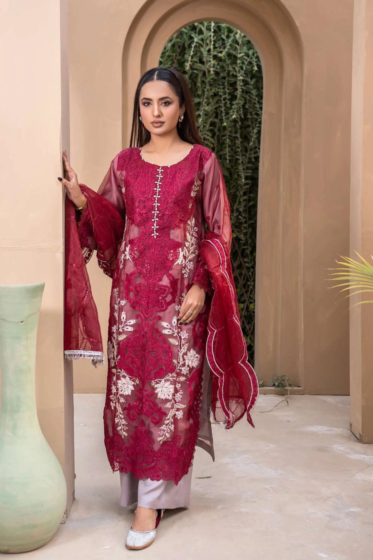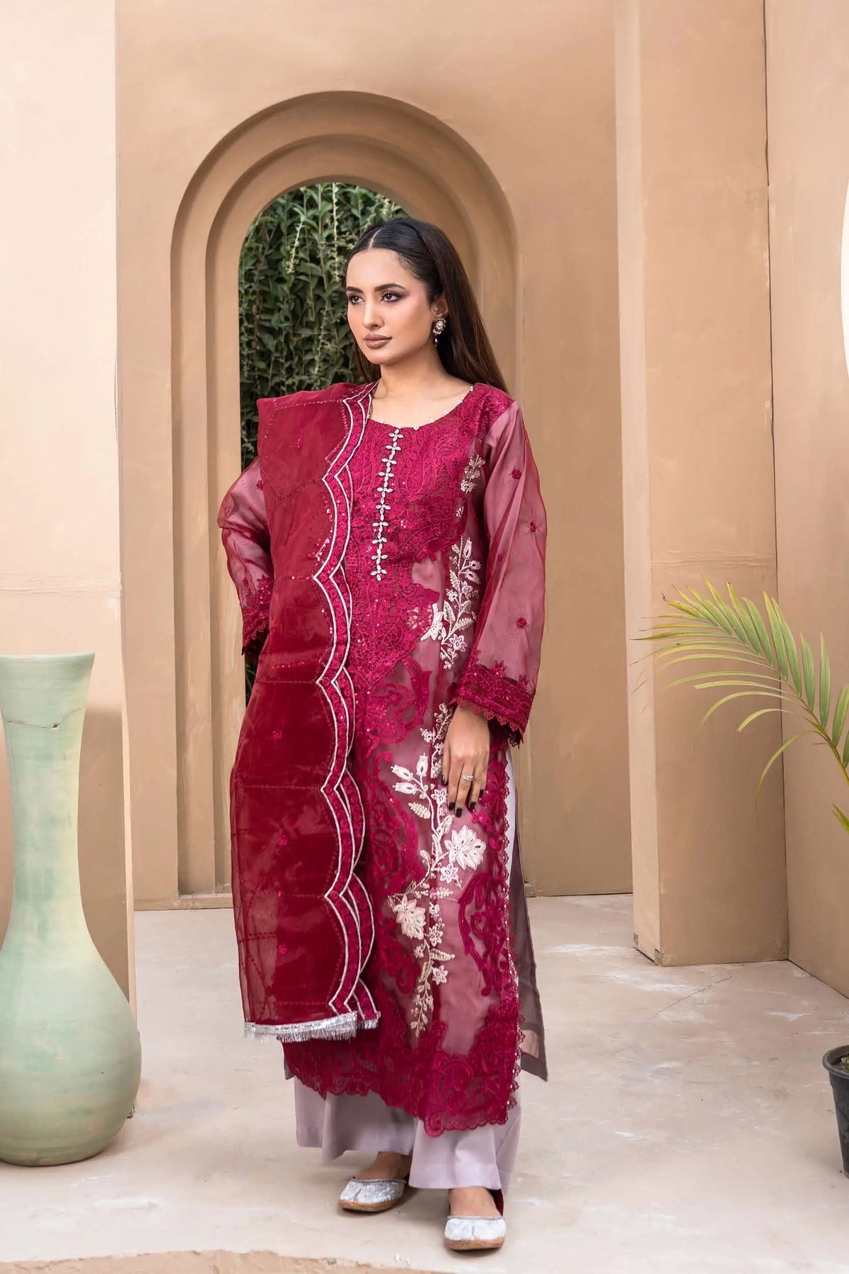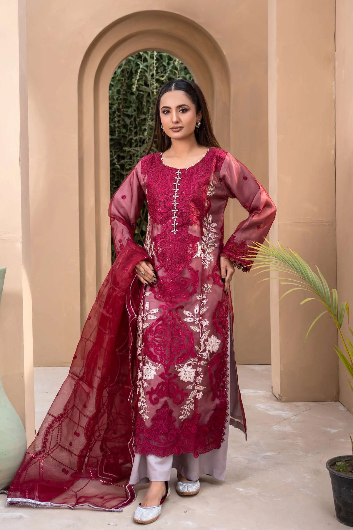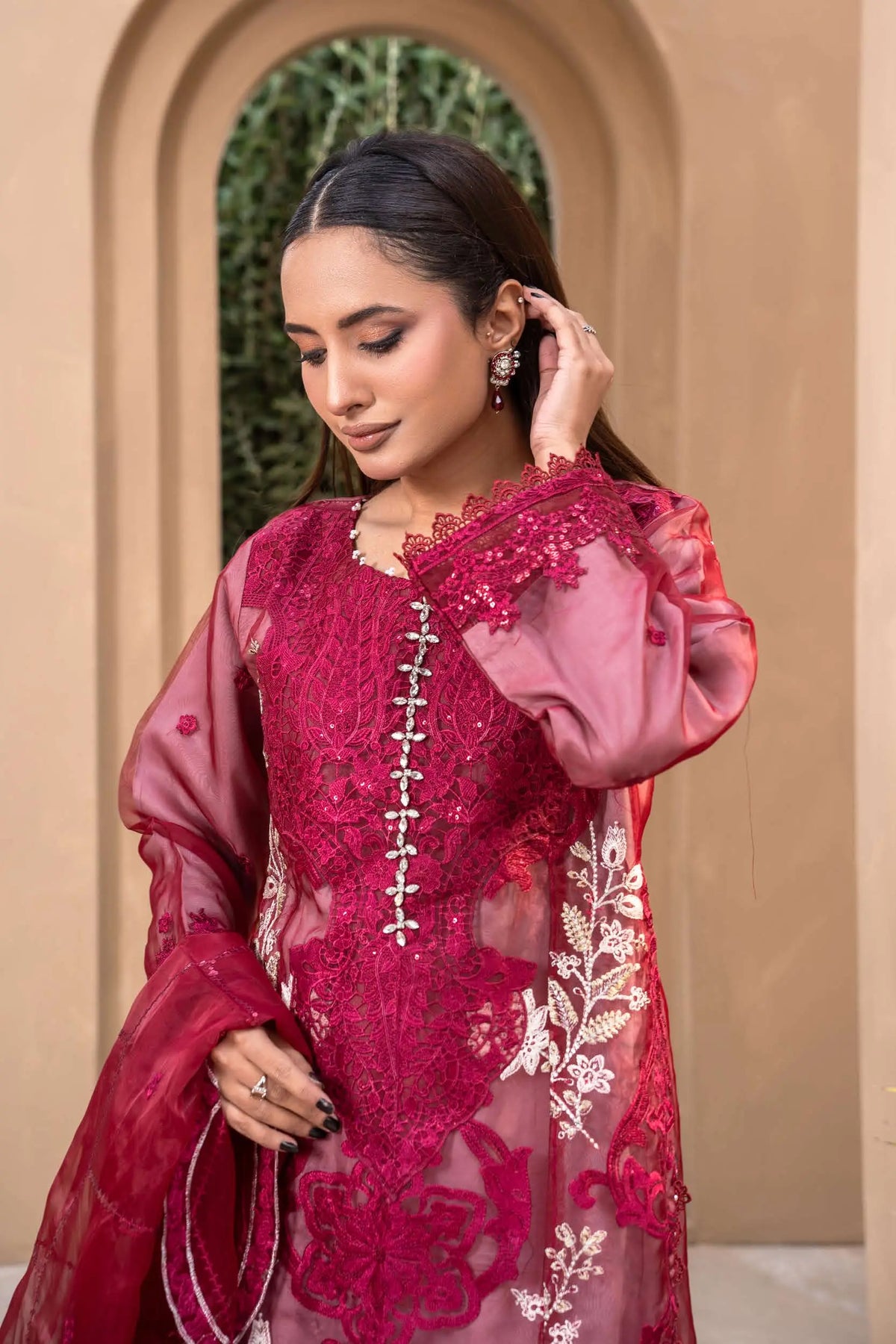 Crafted from premium organza, the shirt features intricate embroidery elevated with exquisite handwork detailing — adding texture, shimmer, and artisanal charm. The combination of fine threadwork and handcrafted accents creates a soft yet striking silhouette, perfect for making an impression this Eid. ✨🌿