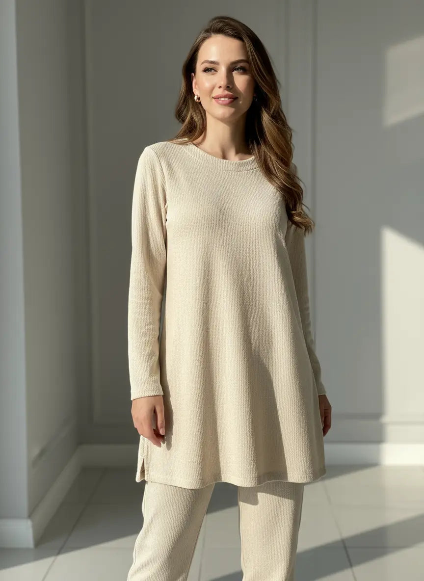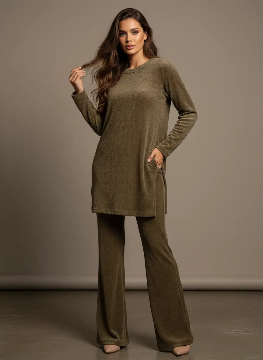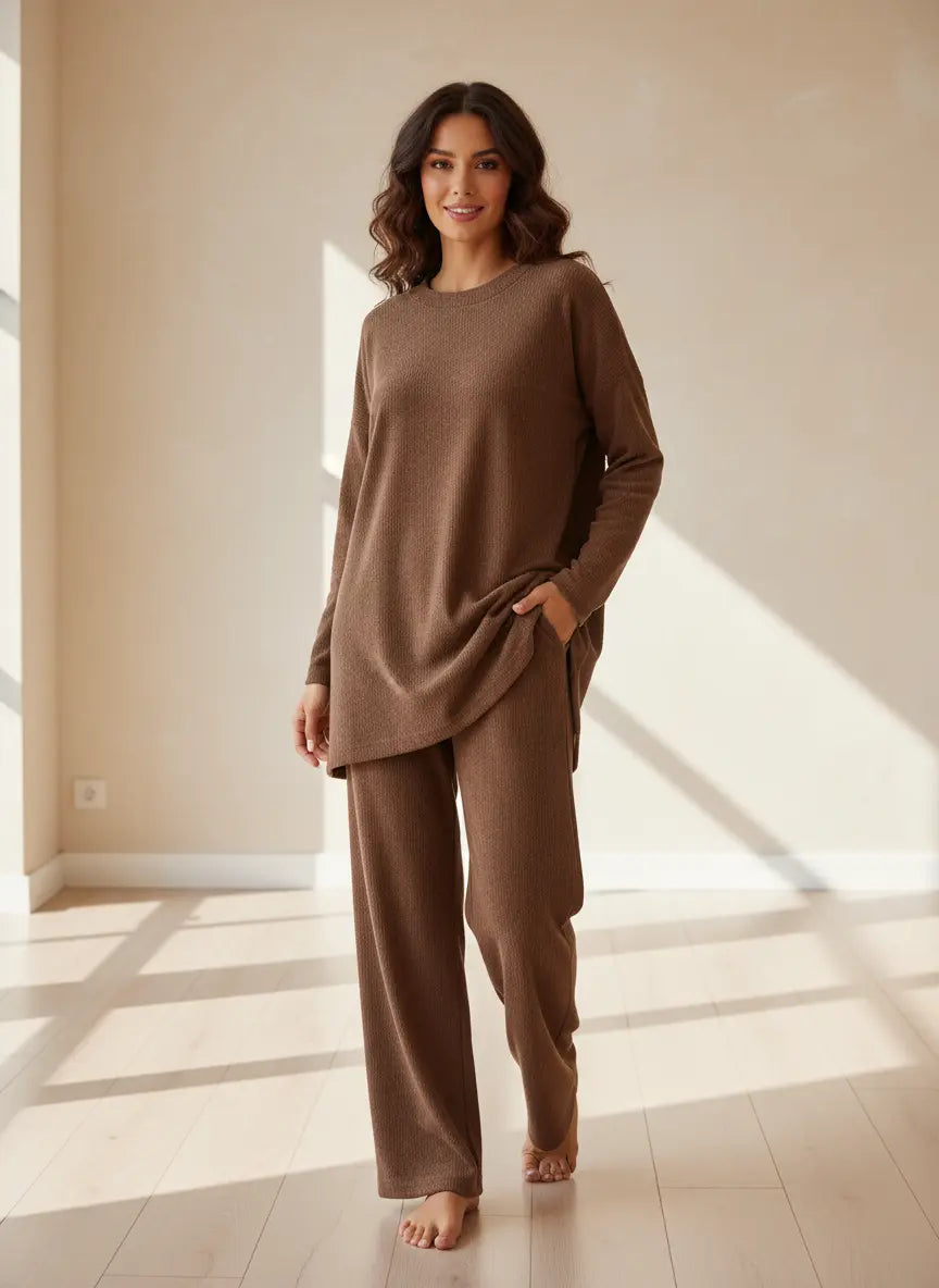 Made from soft ribbed stretch fabric, this set includes a long-sleeve top paired with matching ribbed trousers for a sleek, coordinated look. The textured material adds a touch of elegance while offering flexibility and ease of movement. 🌿