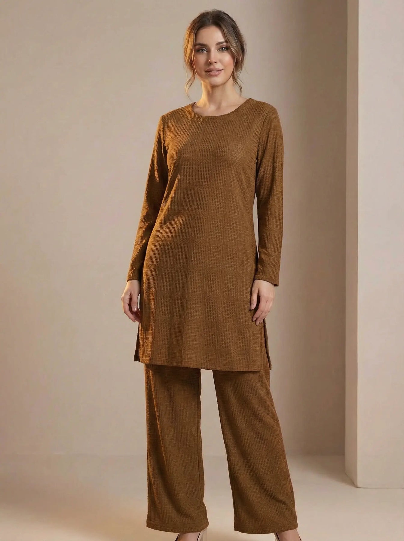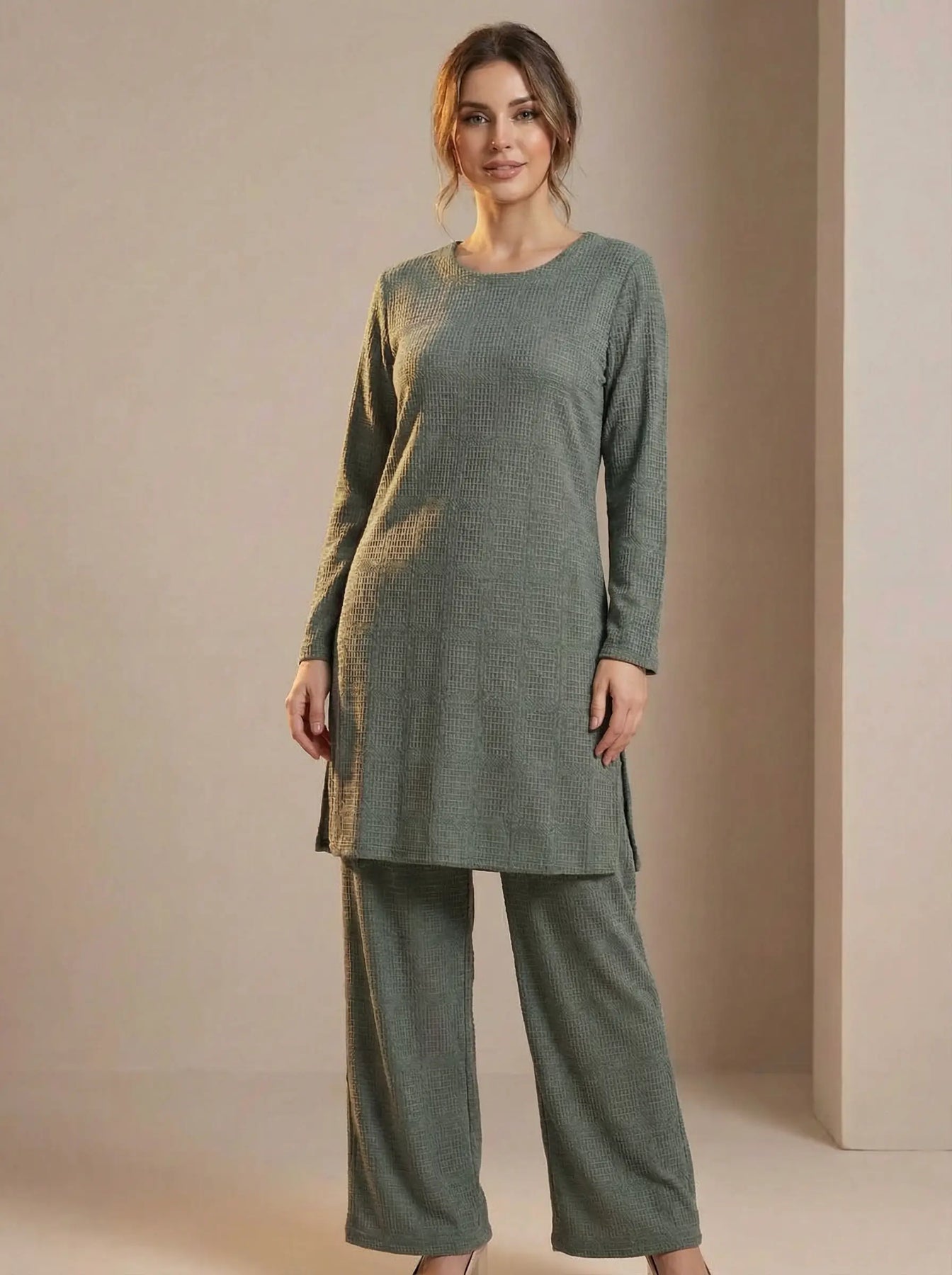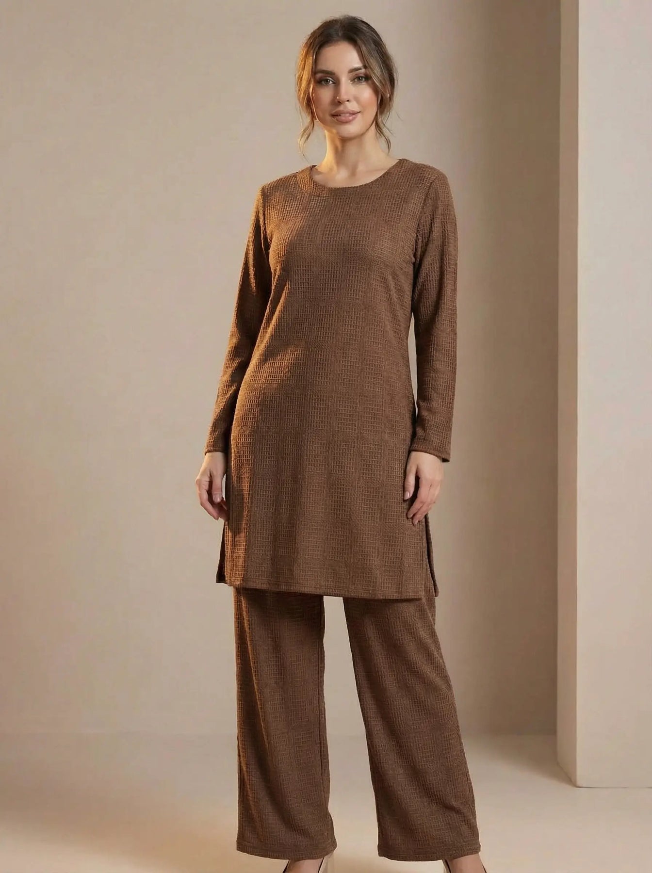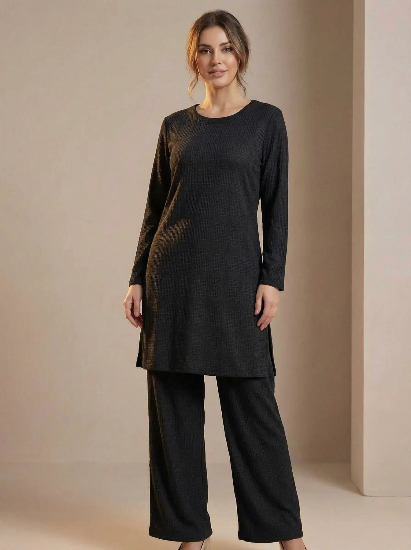 Made from soft ribbed stretch fabric, this set includes a long-sleeve top paired with matching ribbed trousers for a sleek, coordinated look. The textured material adds a touch of elegance while offering flexibility and ease of movement. 🌿
